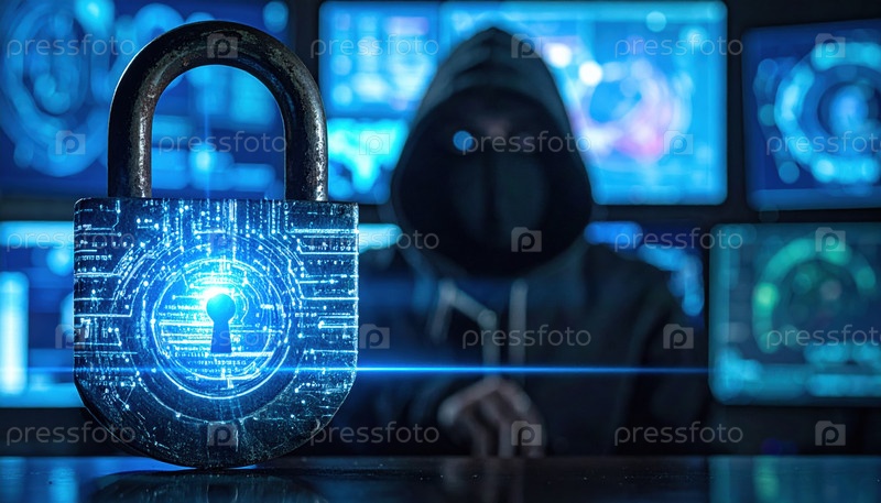 Хакер в темной среде с голограммой замка, символизирующей кибербезопасность, шифрование и защиту данных в цифровую эпоху
