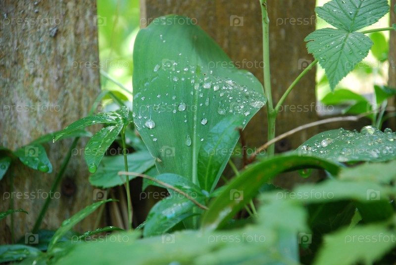 Вода капает на зеленые листья