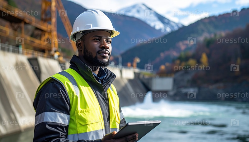Инженер осматривает гидроэлектростанцию с горами на заднем плане, символизирующими возобновляемые источники энергии, устойчивость и современную инфраструктуру