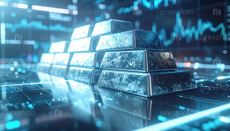 Куча блестящих серебряных слитков, символизирующих богатство, стабильность и инвестиционные тенденции на футуристическом финансовом рынке с цифровыми отражениями