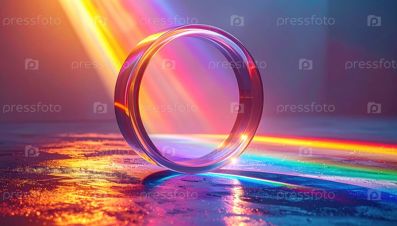 Стеклянная призма, которая рассеивает радужный свет по отражающей поверхности, представляя науку, творчество, теорию цветов и красоту оптических явлений