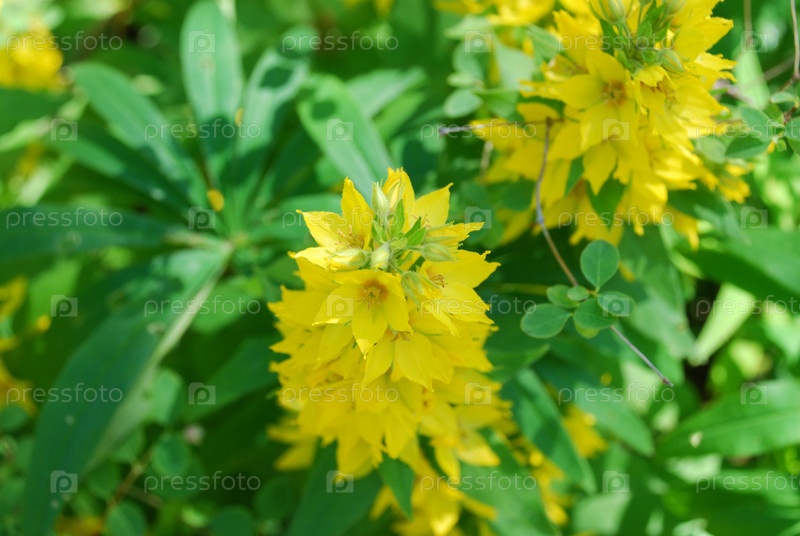 Многие желтые цветы на одном стебле. пятно вербена (Lysimachia punctata)
