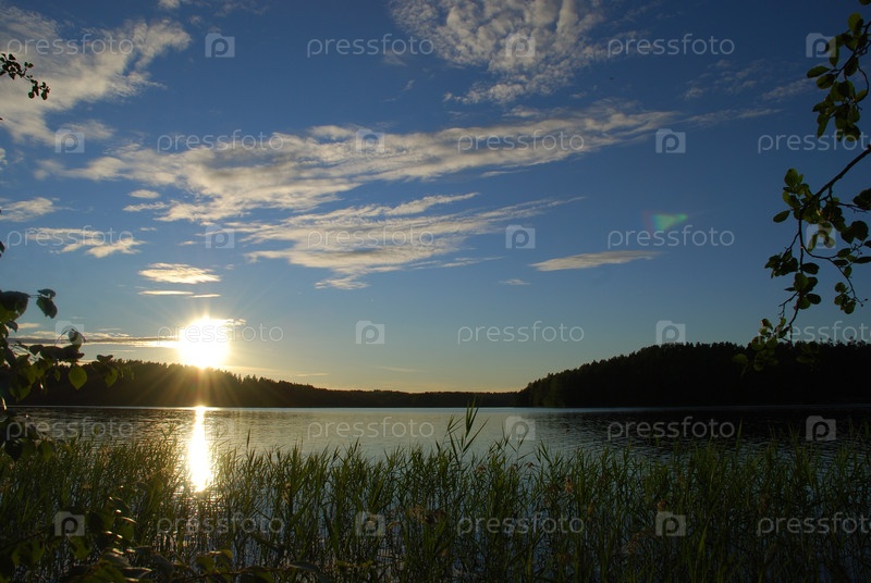 Летним вечером возле лесного озера, недалеко от берега, в воде появляются тростники, растущие на тонких длинных стеблях, зрелых желтых побегах восходящего растения