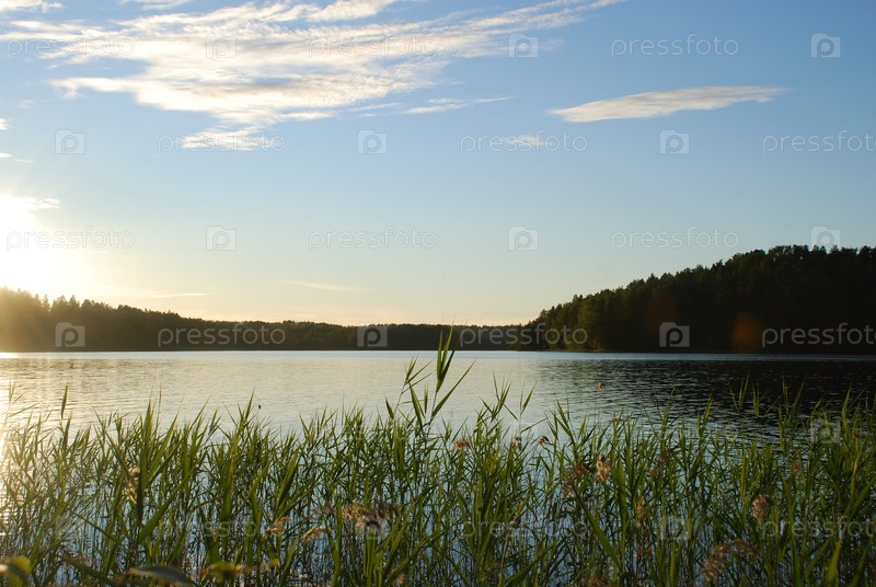 Летним вечером возле лесного озера, недалеко от берега, в воде появляются тростники, растущие на тонких длинных стеблях, зрелых желтых побегах восходящего растения