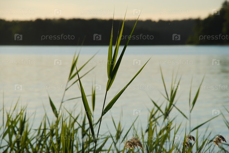Летним вечером возле лесного озера, недалеко от берега, в воде появляются тростники, растущие на тонких длинных стеблях, зрелых желтых побегах восходящего растения