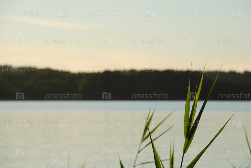 Летним вечером возле лесного озера, недалеко от берега, в воде появляются тростники, растущие на тонких длинных стеблях, зрелых желтых побегах восходящего растения