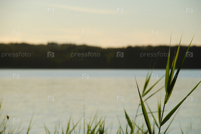 Летним вечером возле лесного озера, недалеко от берега, в воде появляются тростники, растущие на тонких длинных стеблях, зрелых желтых побегах восходящего растения