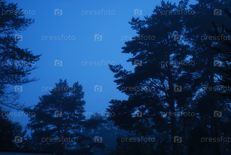 Высокие сосны в ночном тумане