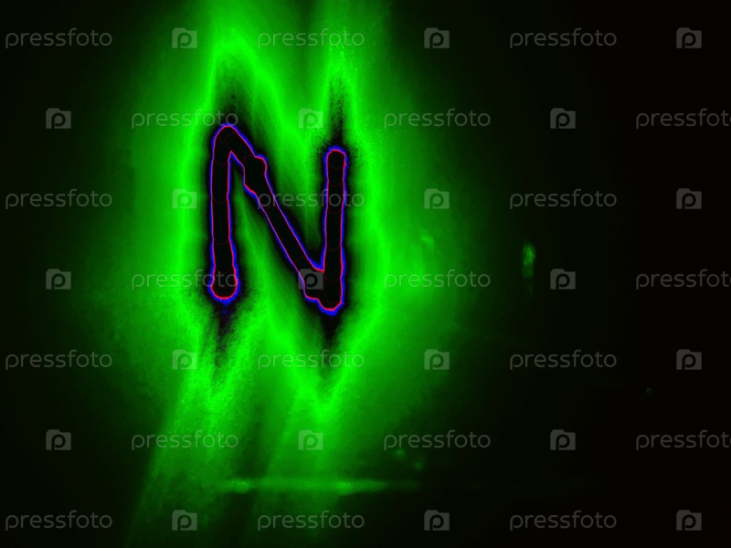 Буква английского алфавита написана вручную на черном фоне с цветными неоновыми линиями.Буква светит красным и синим, создавая вокруг себя зеленый ореол