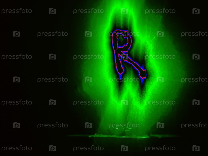 Буква английского алфавита написана вручную на черном фоне с цветными неоновыми линиями.Буква светит красным и синим, создавая вокруг себя зеленый ореол