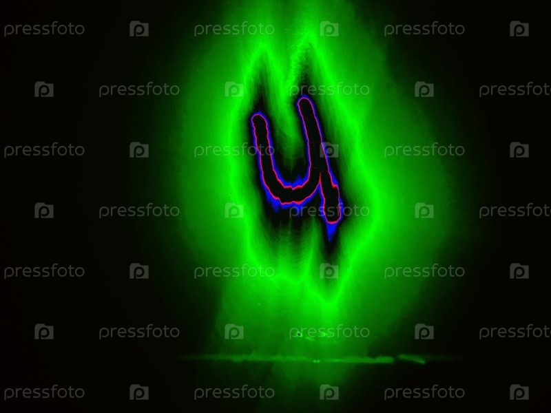 Буква английского алфавита написана вручную на черном фоне с цветными неоновыми линиями.Буква светит красным и синим, создавая вокруг себя зеленый ореол