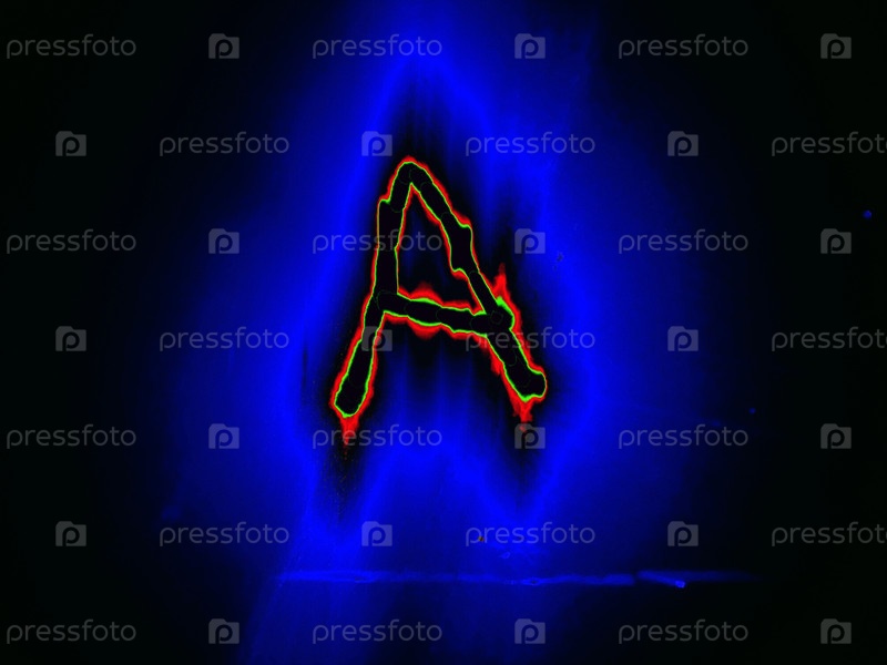 Буква английского алфавита написана вручную на черном фоне с цветными неоновыми линиями.Буква светит зелено-красным цветом по краям, создавая вокруг себя синий ореол