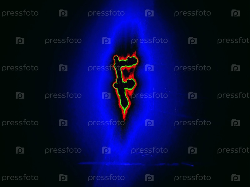 Буква английского алфавита написана вручную на черном фоне с цветными неоновыми линиями.Буква светит зелено-красным цветом по краям, создавая вокруг себя синий ореол