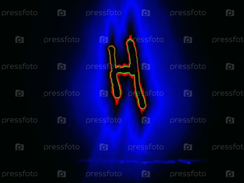 Буква английского алфавита написана вручную на черном фоне с цветными неоновыми линиями.Буква светит зелено-красным цветом по краям, создавая вокруг себя синий ореол