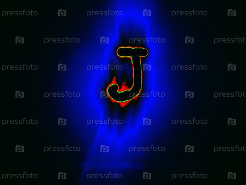 Буква английского алфавита написана вручную на черном фоне с цветными неоновыми линиями.Буква светит зелено-красным цветом по краям, создавая вокруг себя синий ореол