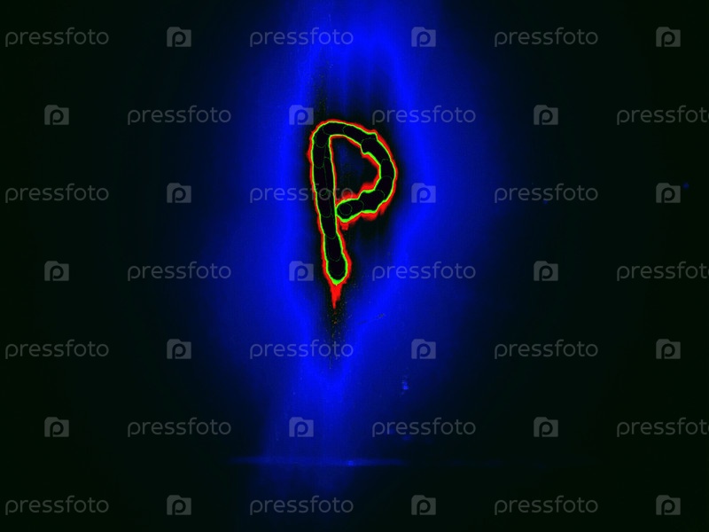 Буква английского алфавита написана вручную на черном фоне с цветными неоновыми линиями.Буква светит зелено-красным цветом по краям, создавая вокруг себя синий ореол
