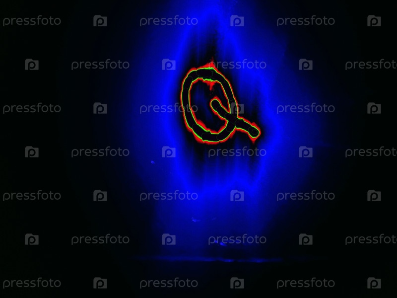 Буква английского алфавита написана вручную на черном фоне с цветными неоновыми линиями.Буква светит зелено-красным цветом по краям, создавая вокруг себя синий ореол