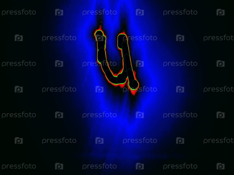 Буква английского алфавита написана вручную на черном фоне с цветными неоновыми линиями.Буква светит зелено-красным цветом по краям, создавая вокруг себя синий ореол