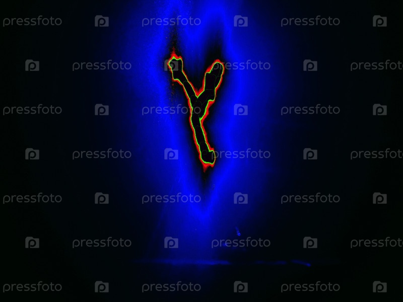 Буква английского алфавита написана вручную на черном фоне с цветными неоновыми линиями.Буква светит зелено-красным цветом по краям, создавая вокруг себя синий ореол