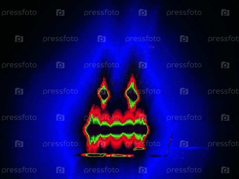 На черном фоне две точки и линия под ними изображены вручную цветными неоновыми линиями.Черное улыбающееся лицо светит зелено-красным по краям, создавая вокруг него голубой ореол