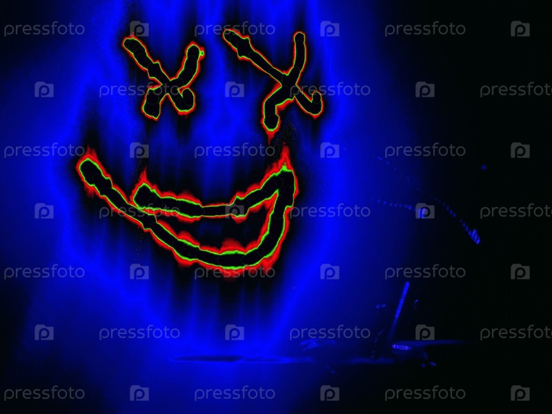 На черном фоне две точки и линия под ними изображены вручную цветными неоновыми линиями.Черное улыбающееся лицо светит зелено-красным по краям, создавая вокруг него голубой ореол
