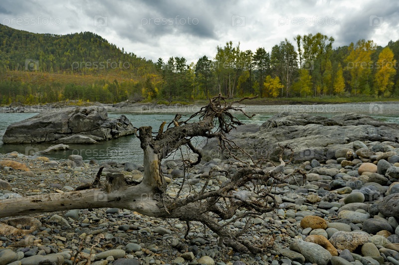 Юг Западной Сибири, Алтайские горы. живописный вид на скальный берег реки Катун осенними цветами возле деревни Манжерок