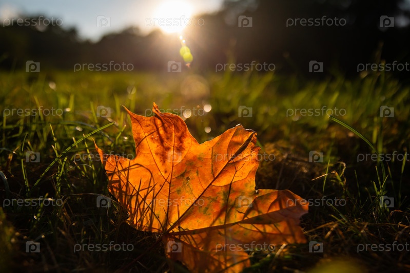 Осенний кленовый лист на траве при закате солнца