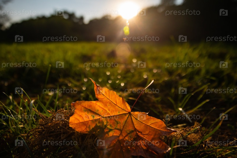 Осенний кленовый лист на траве при закате солнца