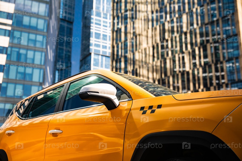 Желтое такси на фоне современных офисных зданий