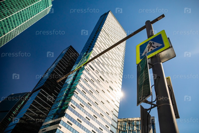 Современные небоскребы и дорожный знак на голубом небе