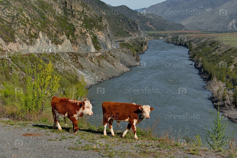 Россия. Западная Сибирь, Алтайские горы. Бесстрашные коровы медленно блуждают по краю высокой скалы глубокого каньона реки Катун вдоль Чуйского пути