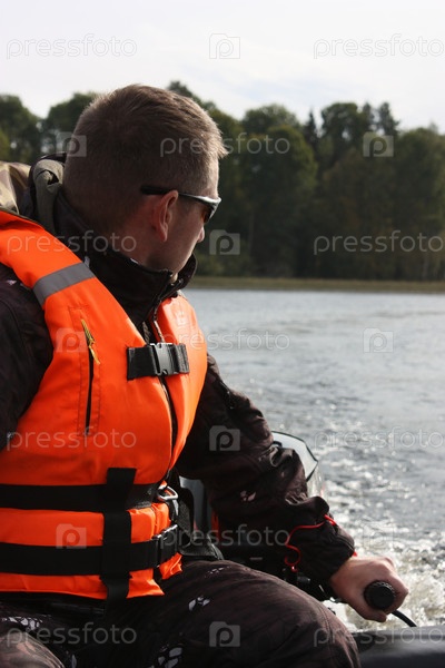 Мужчина в рыбацком жилете управляет моторной лодкой