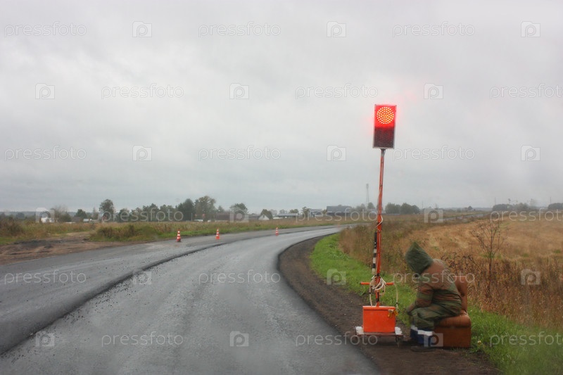 Работник управляет временным светофором