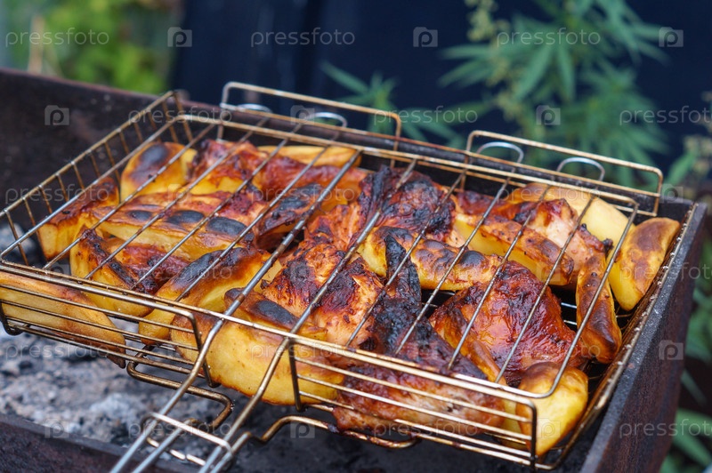 Приготовление курицы и картофеля на углях