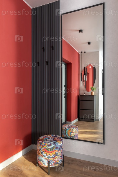 Стильный интерьер коридора с красными стенами и современным дизайном