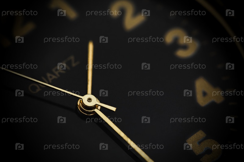 Стильные, минималистичные черные кварцевые часы с золотыми ручками. Близкий план в темных тонах