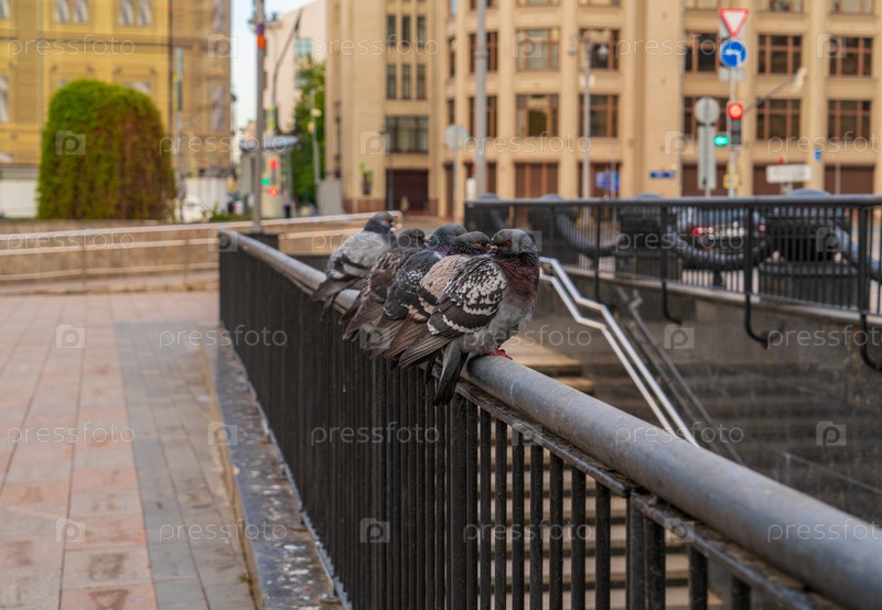 Голуби сидят на заборе на фоне городского пейзажа.Москва, Россия