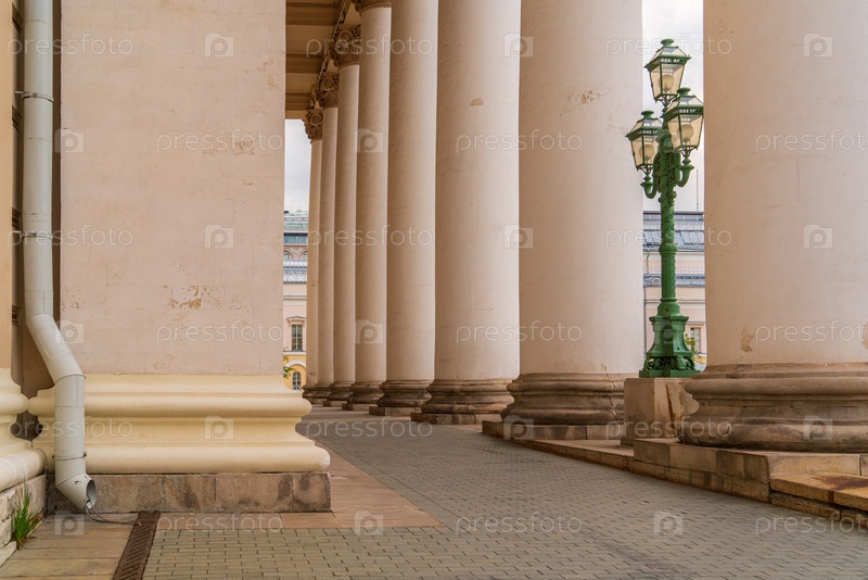 Вид на колонны и красиво украшенный фонарь возле здания театра Архитектурные детали Москва, Россия