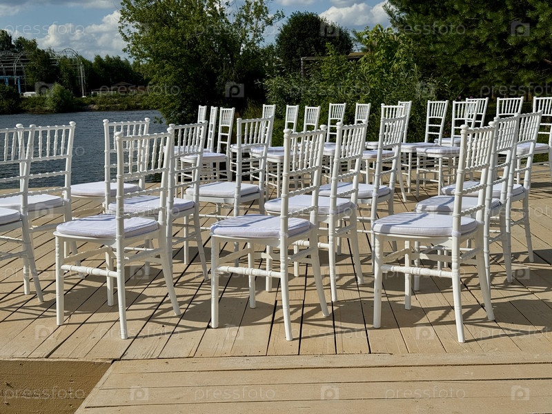 Белые стулья для гостей свадебной церемонии находятся на сайте