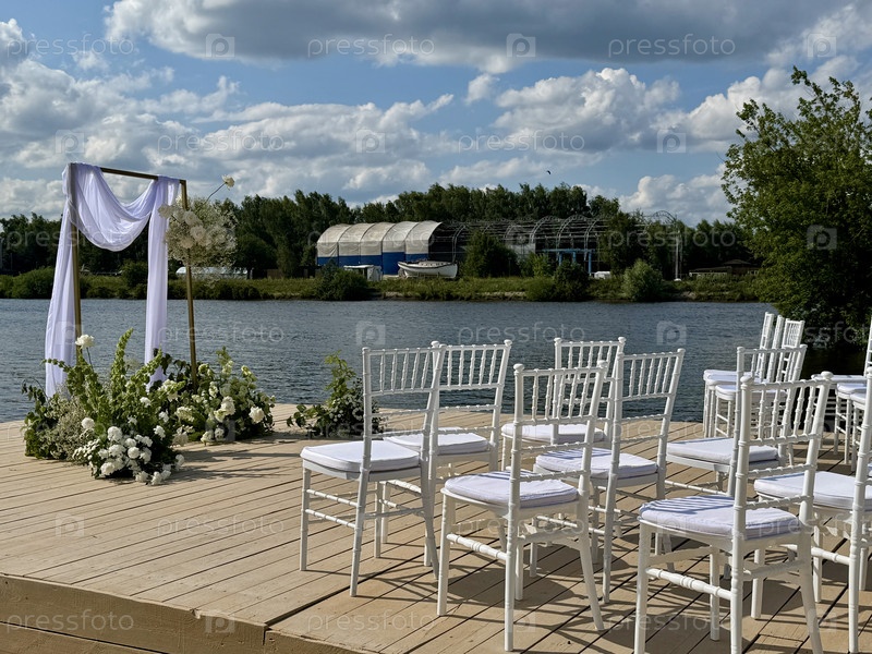 Белые стулья для гостей свадебной церемонии находятся на сайте