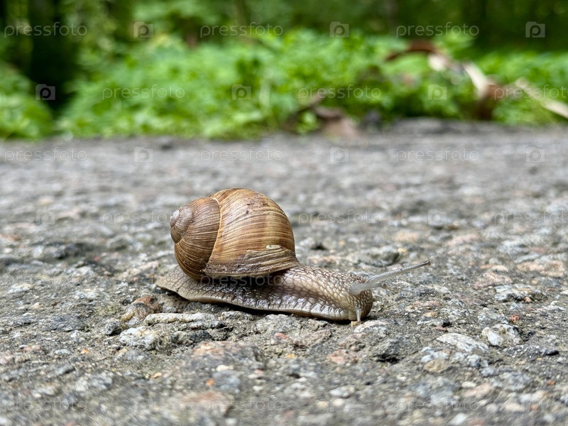 Красивая улитка с раковиной ползает по асфальту летом в городском парке