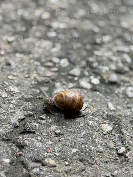 Красивая улитка с раковиной ползает по асфальту летом в городском парке