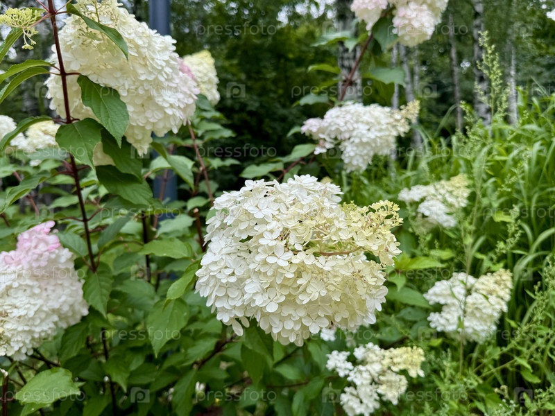 Белоцветная гортензия в летний день в городском парке