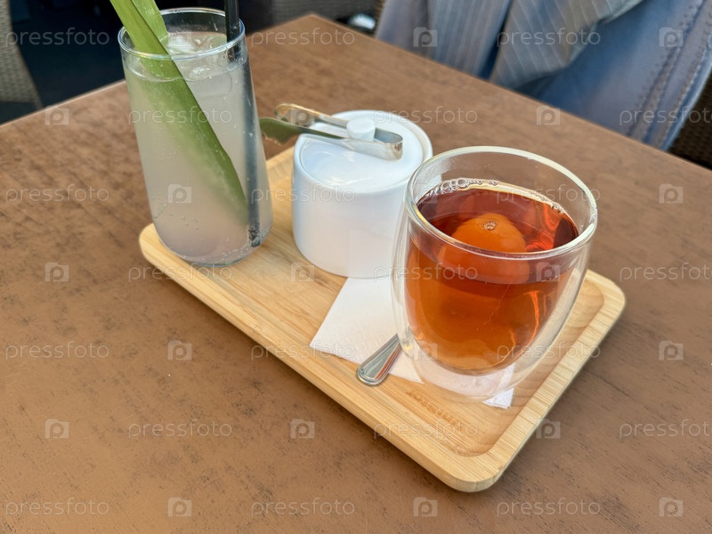 Чашка чая и лимонад на столе в летнем кафе