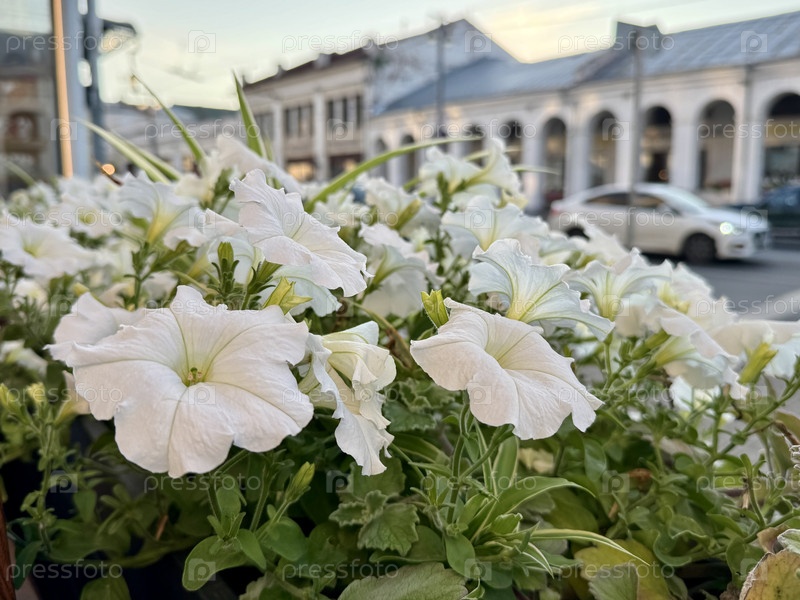 Петуния цветет на фоне городского пейзажа в летний день