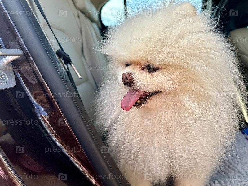 Счастливый белый шпиц в машине