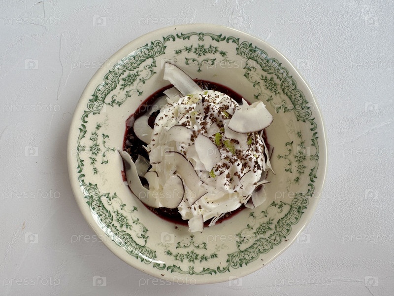 Вкусный десерт из вишни, кокосового сливочного и измельченного шоколада