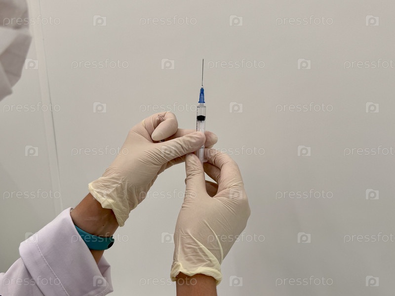 Врач в белом пальто держит шприц для вакцинации