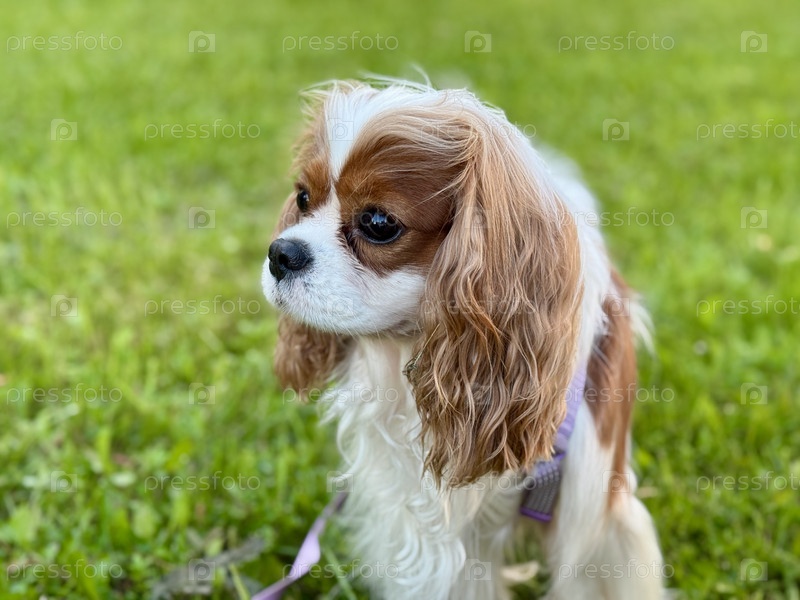 Happy King Charles Spaniel, английский игрушечный спаниель на прогулке летом
