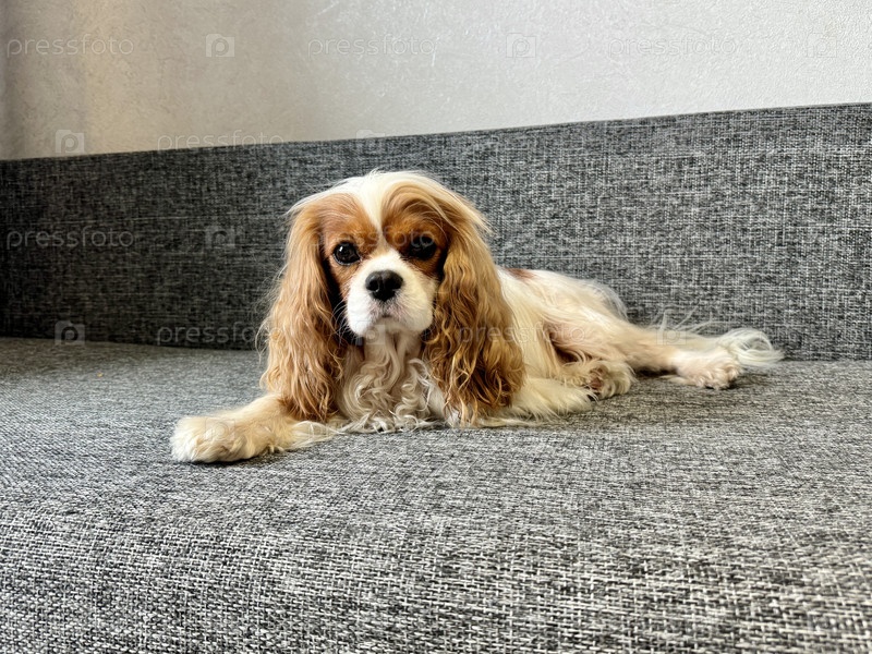 Красивый король Чарльз-спаниель, английский игрушечный спаниель, лежит на диване дома
